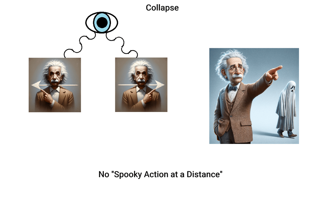 Continuing in this vein, when does (*) collapse? Say synchronized clocks are available at both ends of the experiment. Suppose the spins of both particles are measured at the same time according to these clocks. An observer located halfway between the two measurement points can receive information about the results of both measurements simultaneously. This observer sees the results for each particle of the spin measurement in a direction relative to some visible reference points. The reference points are matched up, giving the angle ξ between the now labeled “sticks”. Now only one of the four tensor product states in (**) applies. We have collapse. The information about the individual measurements on the two particles reaches the observer at light speed. No superluminal communication between the particles as their spins are measured is required. Information proceeds from the measurements to the observer at the speed of light. No “spooky action at a distance”.