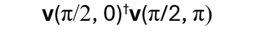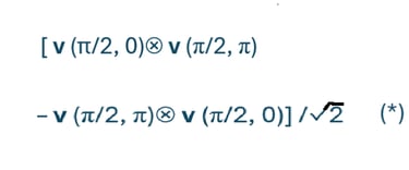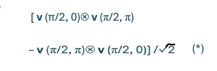 Through linear combinations of tensor products of pure states of individual particles we can create correlations between the particles. In fact, for the state (*) the values of “Left” and “Right” are perfectly anticorrelated, as conservation of angular momentum requires. The state “Left” ½, “Right” ½ is given by v(π/2, 0) ⮾ v(π/2,0). When the complex conjugate transpose of this is multiplied by the first tensor product term in (*), the result will be