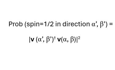 Exhaustive explanations of why this spin state is applicable can be found in many physics texts. One thing that is clever about it is that it allows for a measurement of spin in another direction to be only ½ or –½. Suppose we now measure the spin of the particle another direction α’ and β’. Let v(α, β) represent the spin state vector above, and v( α’, β’) represent the vector with α’ and β’ replacing α and β respectively in the vector above. Then the probability that the particle has spin ½ in the new direction is given by the squared magnitude of the conjugate transpose of the state vector for the new direction times the initial state vector: