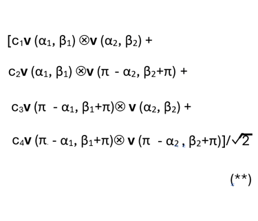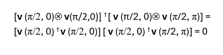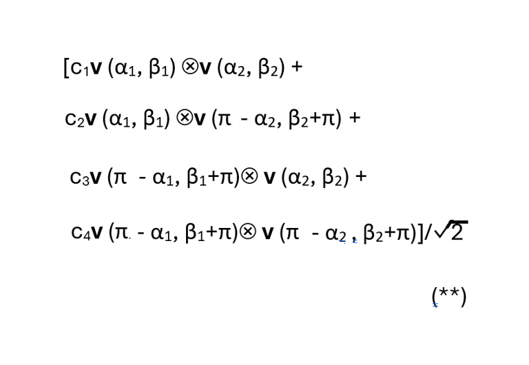 the coefficient that that goes with the v(α, β) ⮾ v(γ, δ) term in (**) divided by the normalization constant. Similarly, multiplying the conjugate transpose of v(α, β)⮾ v(π– γ, δ + π) by (**) will produce the coefficient associated with v(α, β)⮾ v(π– γ, δ + π) in (**), again divided by the normalization constant. The probability that one of these two mutually exclusive tensor products states will obtain after measurement on the two particles will be the sum of the squared moduli of their coefficients in (**), divided by 2. One of the squared moduli of these two coefficients will be