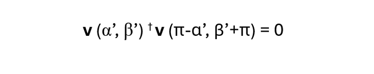 Carrying the quantum mechanics a bit further, it is important for the arguments below to note that the state vector v(α’,β’) and the state vector v(π-α’, β’+π) associated with the measurement –½ are called pure states (The arguments π-α’ and β’+π of the state vector we present for a –½ result may be out of the stated ranges, but when substituted in the formula for v given above will give the correct state). The pure states are orthogonal: